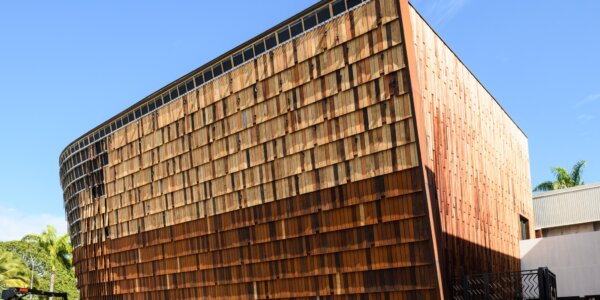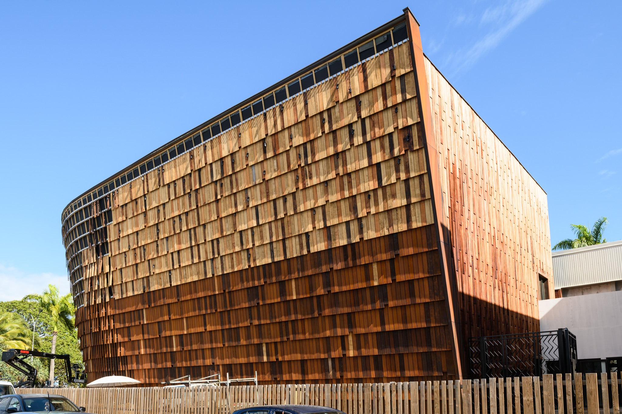Bardage en écailles de bois exotiques et d'acier corten (en cours de pose)